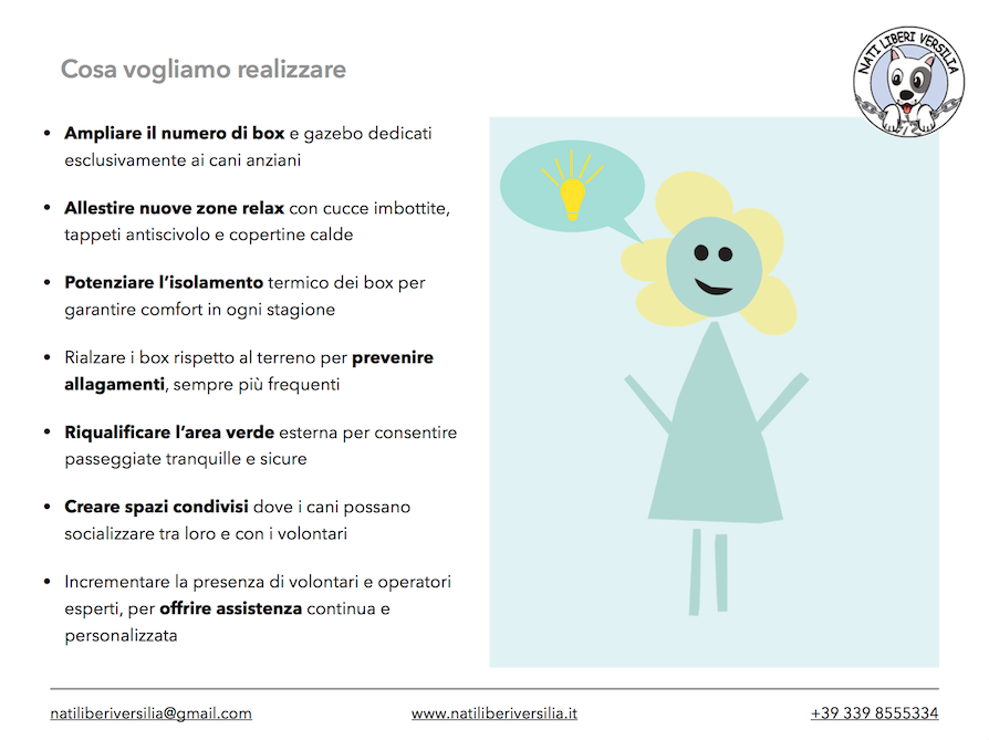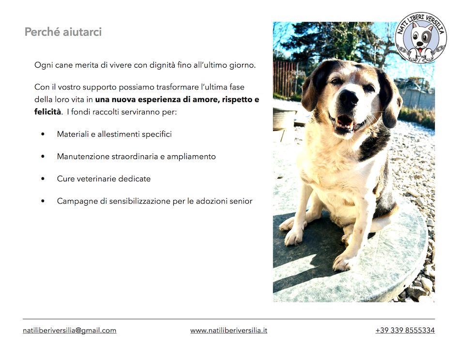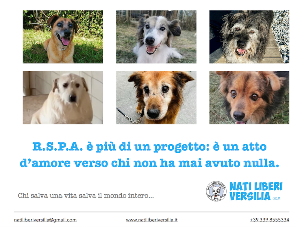 La nostra associazione collabora da molti anni con i volontari che operano fattivamente nei canili sovraffollati del Sud Italia, soprattutto in Campania; fra le centinaia di cani detenuti nei box ci sono moltissimi anziani, che da sempre vivono reclusi e che hanno molte meno speranze di essere adottati rispetto ai cuccioli e ai cani giovani in generale. Per questo la ns associazione ha sempre cercato di accoglierli nel proprio rifugio, per ridare loro prima di tutto dignità e libertà e poi una famiglia che faccia conoscere loro tutto quello che non hanno mai potuto vivere. Regalare una seconda possibilità a un cane anziano significa cambiare il finale della sua storia. Abbiamo sempre dato ai nonnini il nome di un fiore, per vederli finalmente sbocciare al rifugio: Giglio, Ginestra e Girasole i primi anziani liberati, poi Gigliola e Gelsomino e dopo altri ancora. Abbiamo, quindi, progettato e iniziato a realizzare uno spazio “rsa” destinato all’accoglienza dei soli cani anziani, che con questo contributo vorremmo ampliare e potenziare: la Residenza Spensierata per Pelosi Anziani nasce dall’esigenza di offrire una vita dignitosa, serena e piena d’amore ai cani anziani che hanno vissuto tutta la loro vita in gabbia. Non solo un rifugio, ma una vera e propria “casa di riposo” pensata per loro, con spazi confortevoli, tranquilli e con persone pronte a donare loro tempo, attenzione e affetto, nella speranza che trovino una famiglia adottiva. Perché i nonnini meritano di conoscee l’amore prima che sia troppo tardi. RSPA è più di un progetto: è un atto d’amore verso gli ultimi degli ultimi, che non hanno mai avuto nulla. Fra i nostri obiettivi vi è anche quello di sensibilizzare i bambini delle scuole che ogni anno vengono in gita al rifugio e restano sempre molto colpiti dalla dolcezza dei nonnini ancor prima che dall’entusiasmo dei cuccioli. Spesso sono stati proprio i bambini a scegliere di adottare un cane anziano, come nelle favole!